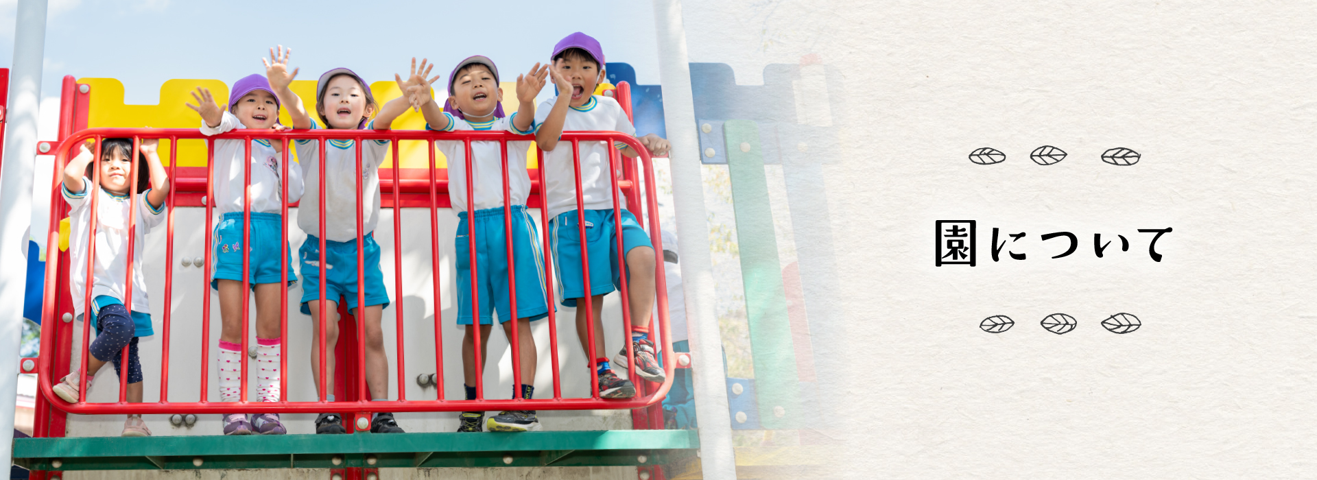 とにかく広々。思い切り走り回れる園庭をはじめ、好きなことにめいっぱい取り組める環境は当園の自慢の一つです。「あかるく、のびのび、げんきな子」を目指し、全身を使う遊具をたくさん設置しています。