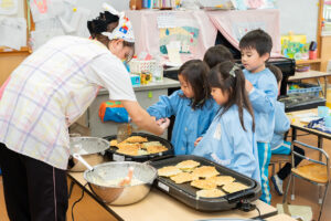英語指導のプロであるECC様に講師を依頼し、楽しく外国語に触れられる時間を作っていただいています。歌、踊り、クイズや絵本を取り入れ、自然と英語に馴染める内容です。