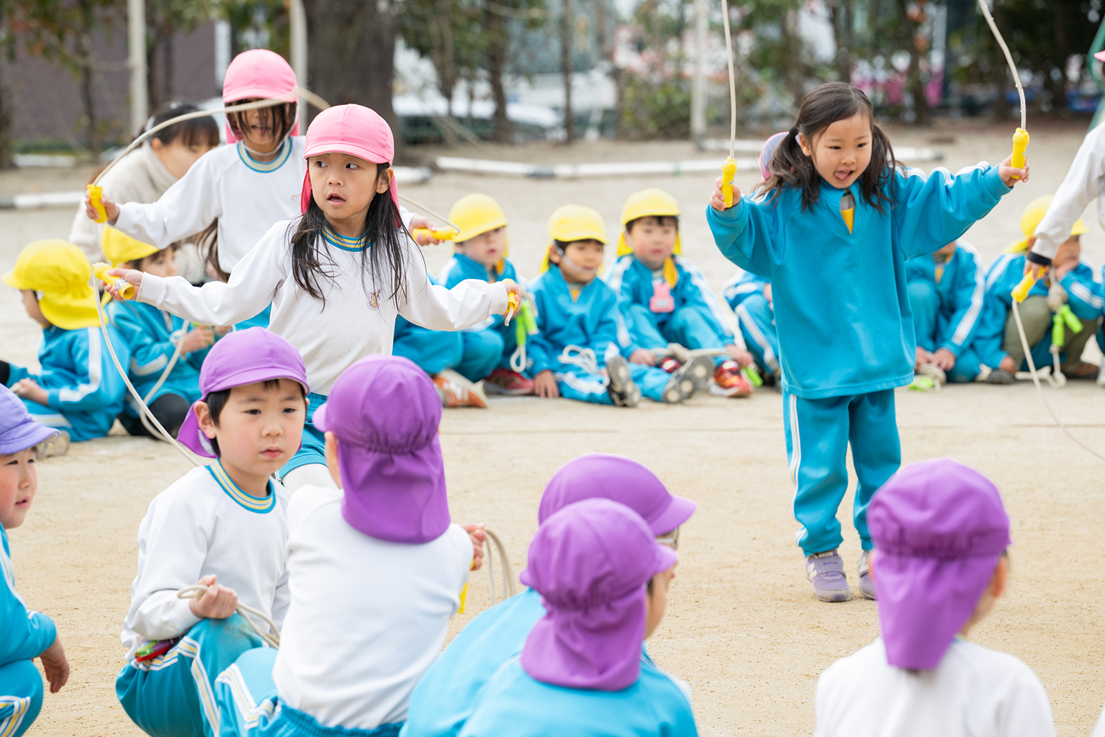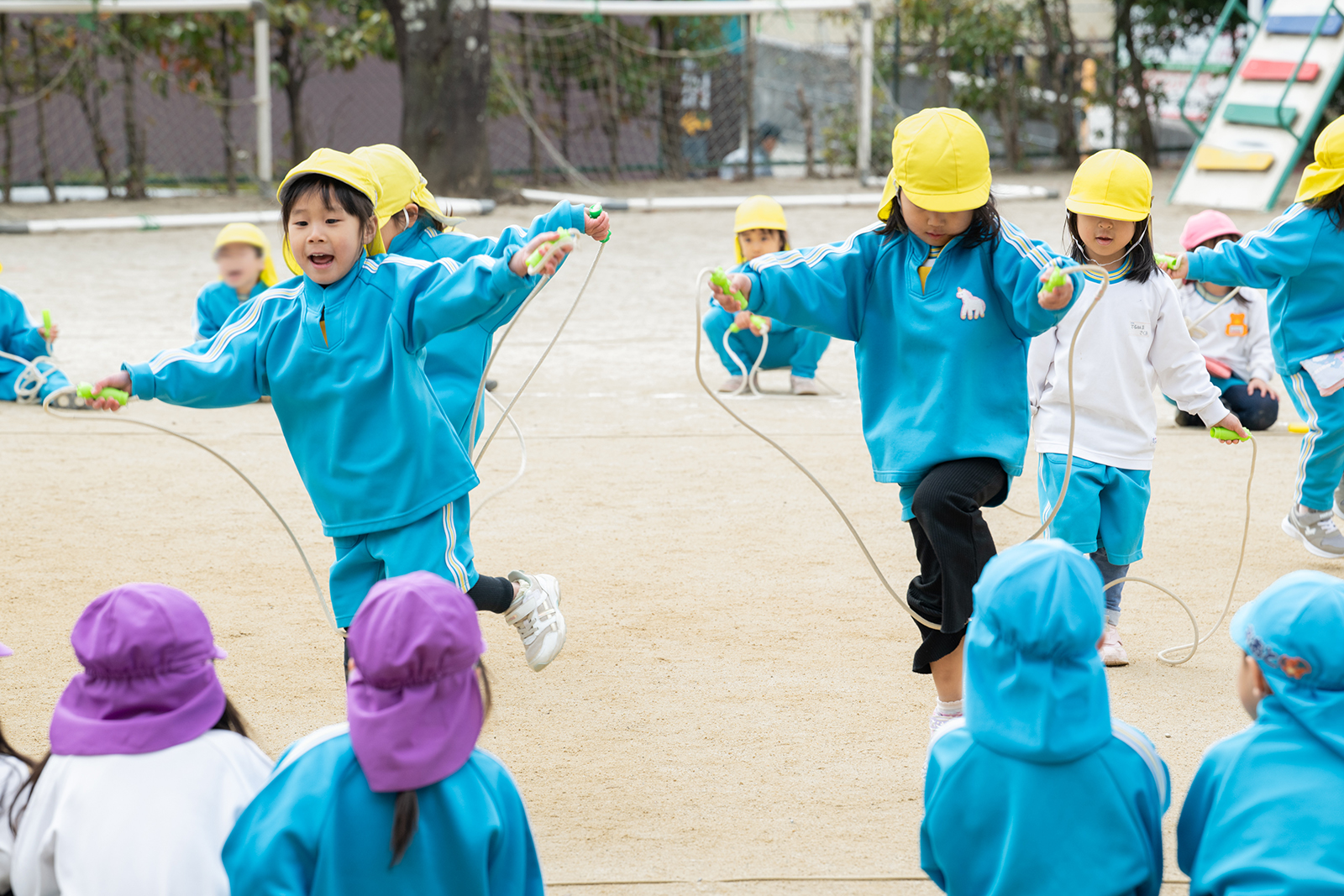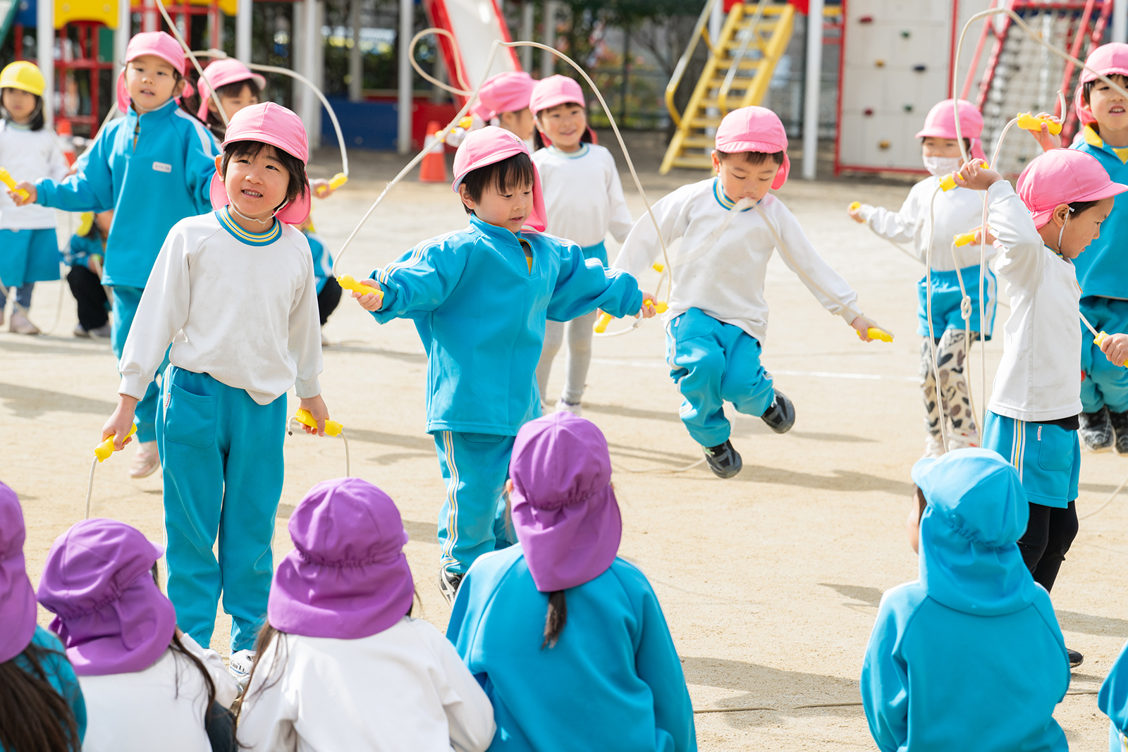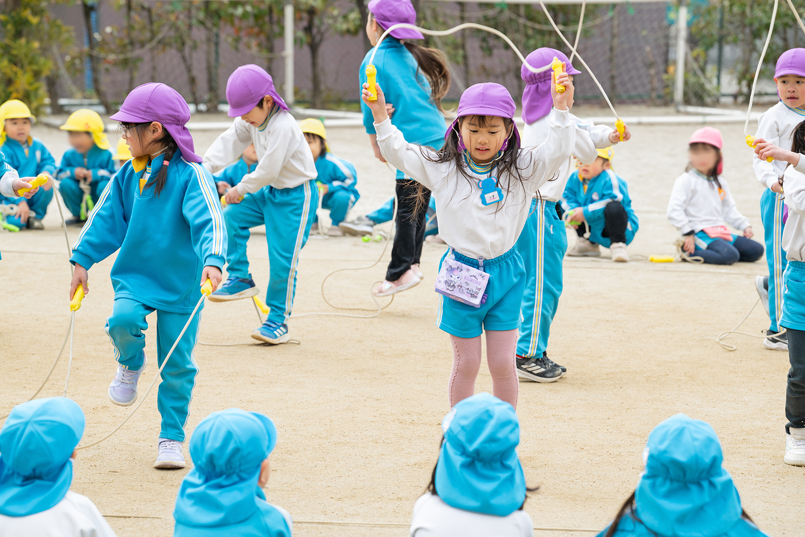 園児たちは11月頃から一生懸命なわとびの練習をしてきました。年中さんは前跳び100回、年長さんは200回と、体力に合ったチャレンジ目標が決まっています。
