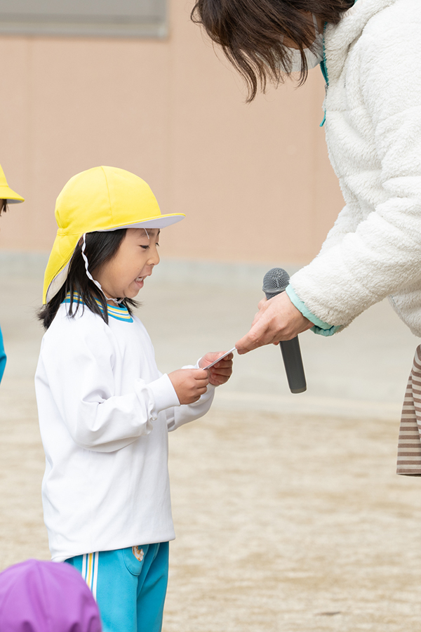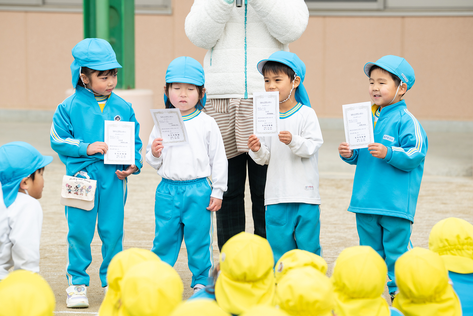 練習の中で、学年ごとのチャレンジ目標を達成した園児に賞状をプレゼントしました。達成できなかった子も「来年はもっと頑張ろう」「小学校へ行ったら縄跳びをもっと上手になりたい」と思ってくれたのではないでしょうか。
