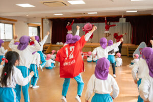 大盛り上がりだった園での「ジャンボくんキャラバン」。目玉はやはりチアリーダーさんによるチアダンス教室です。これは動画のほうが分かりやすいと思います。