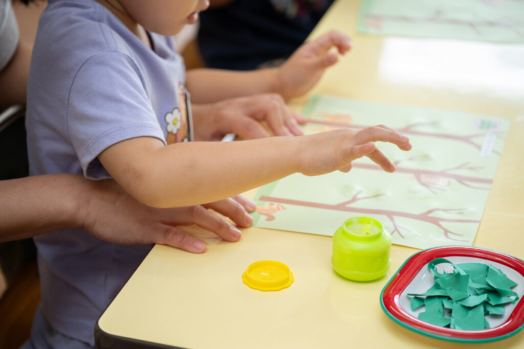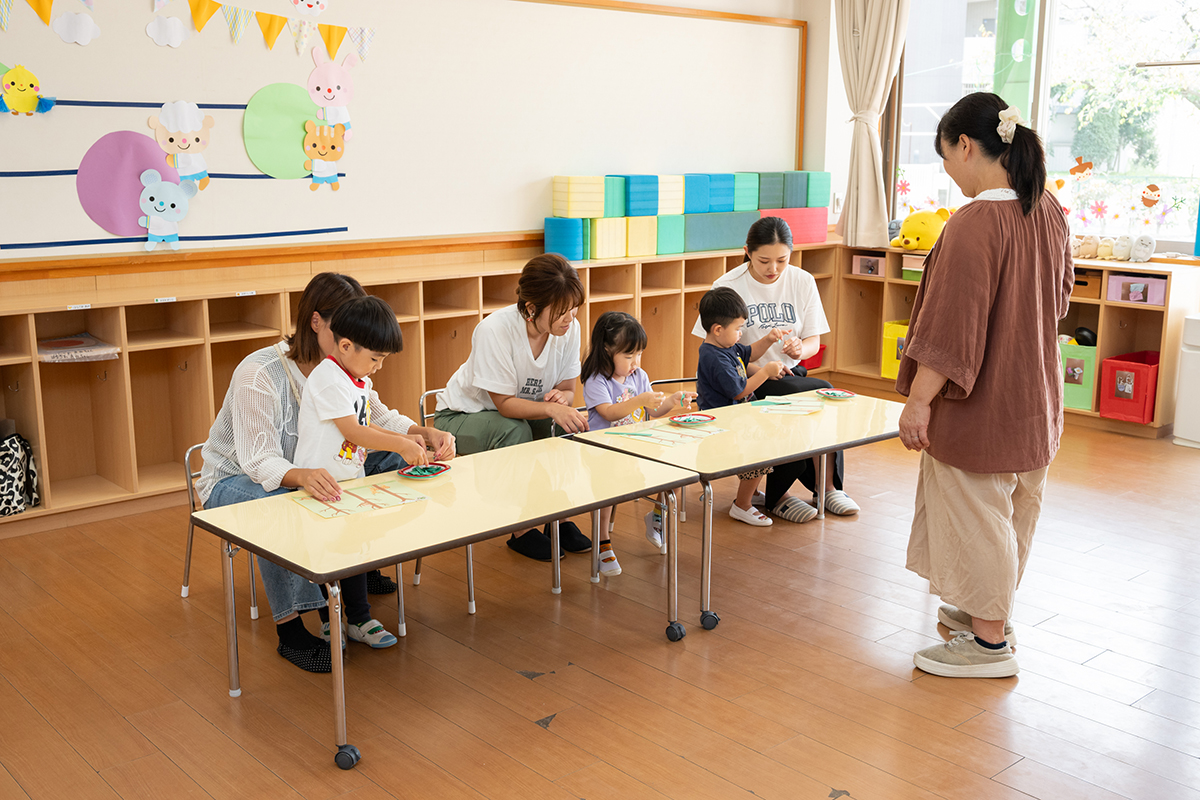 親子で手遊びや体操、クイズや創作活動をしながら、家の外での生活や他人との関わりに慣れていきます。その中で、手指や脳もたくさん動かします。
