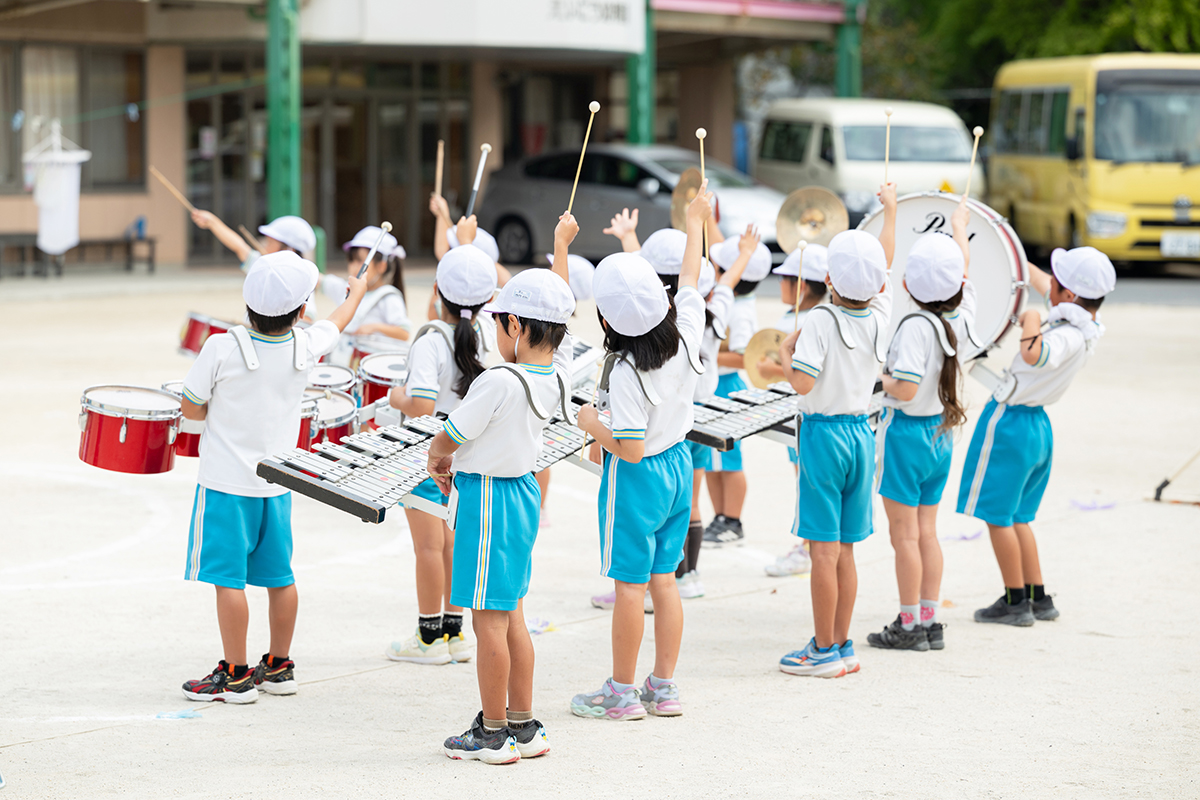 数十年間続く鼓笛隊の取り組み。年長さんが運動会での発表へ向け、約半年かけて練習します。大人でも「難しい」と感じる曲の演奏に毎回挑戦しています。